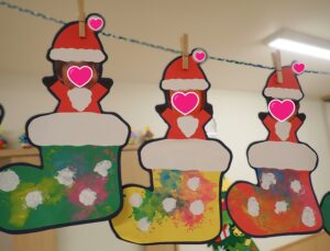 あんず組(1歳児)は靴下に絵の具をポンポンと模様をつけて、とてもかわいらしいですね