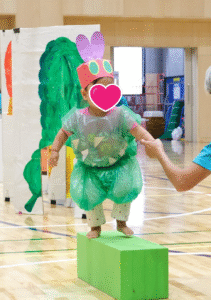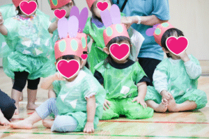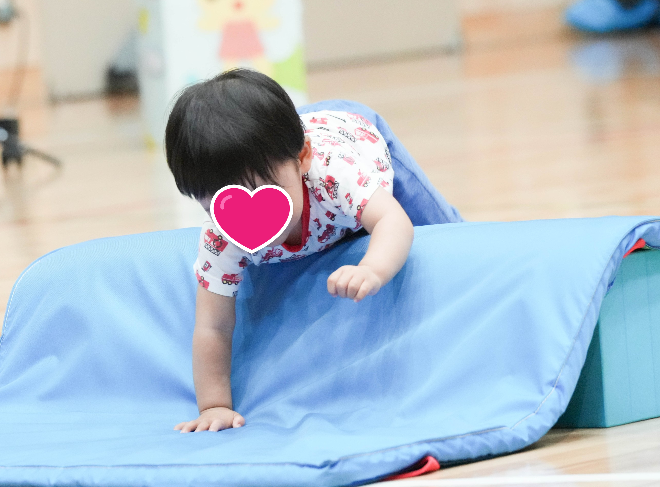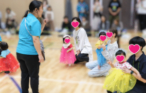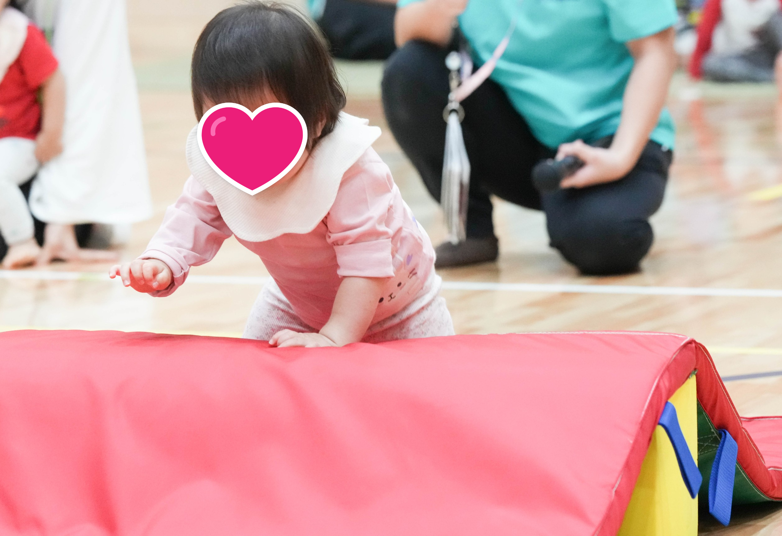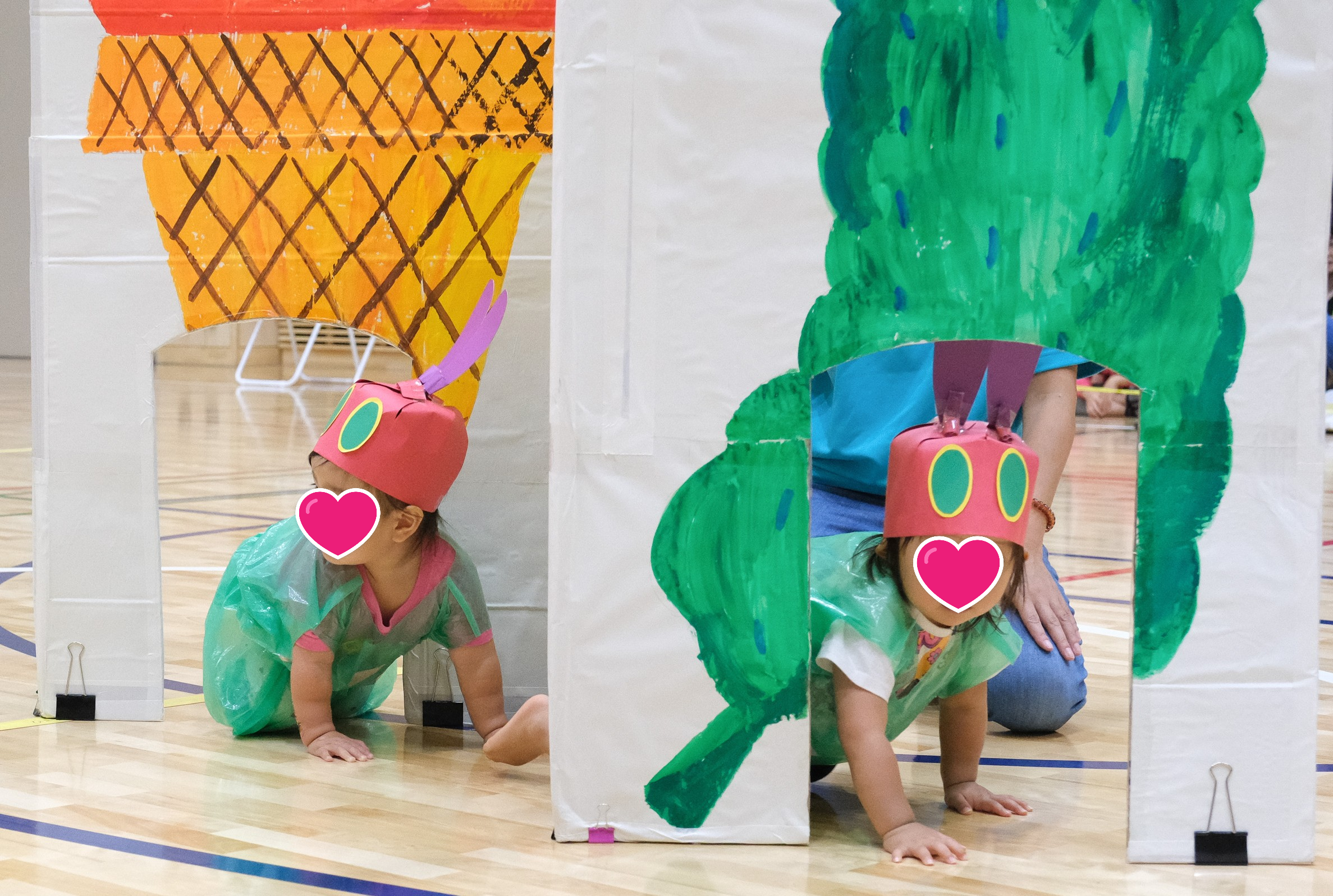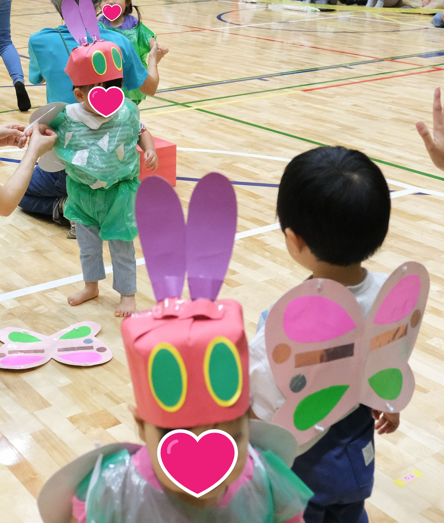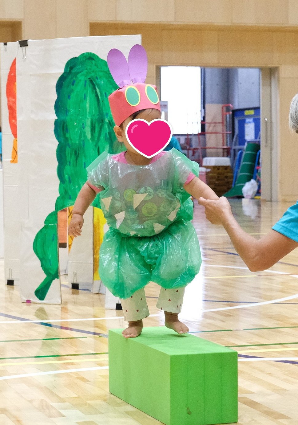 1歳児クラス(あんず組)ははらぺこあおむしになりきって、ゴールを目指しました。はらぺこあおむしの音楽に合わせて、かわいいあおむしさんたちがすすんでいく姿に、会場が癒しにあふれていました。