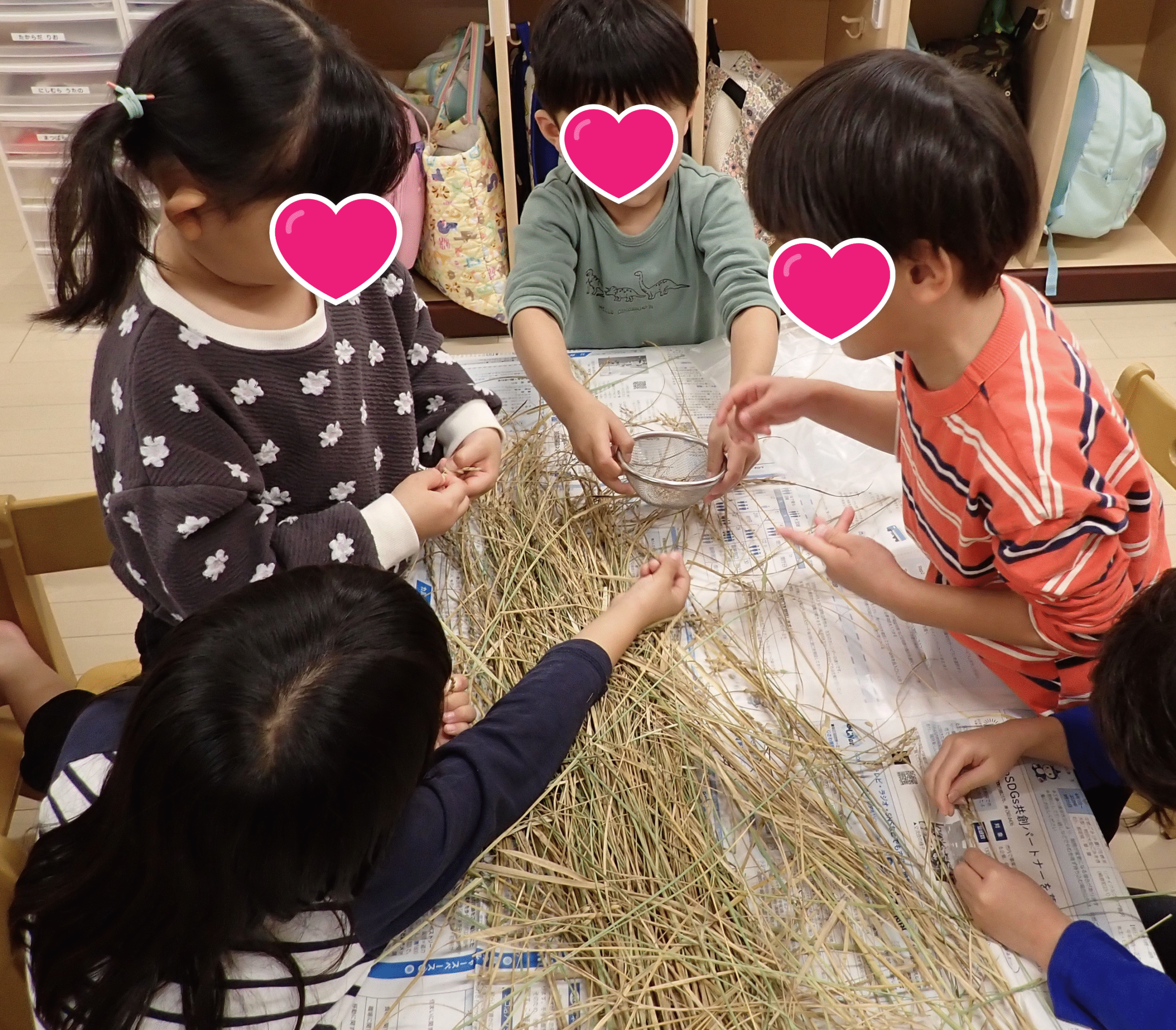 まず乾燥した稲から米を一粒一粒取り除きます。もちろん手作業です(笑)